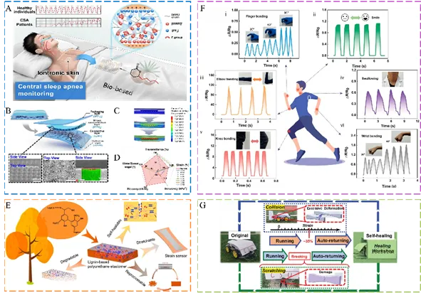 图5 生物基聚氨酯在柔性传感领域的应用。(A) 监控睡眠的离子电子皮肤示意图。(B) 离子皮肤结构及电极SEM图。(C) 离子皮肤的有限元力学分析。(D) 离子皮肤综合性能对比。(E) 自修复可降解木质素基传感器示意图。(F) 手指多角度弯曲信号检测。(G) 基于自愈合水性生物基聚氨酯的自动归位手推车示意图。