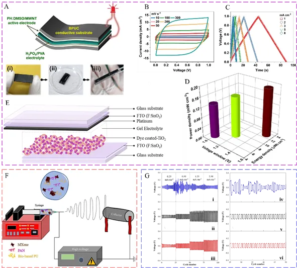图6 生物基聚氨酯在柔性储能领域的应用。(A) 生物基聚氨酯柔性超级电容器组装示意图及实物展示。(B) 在不同电压窗口下测量的拉贡图。(C) 在不同扫描速率下获得的CV曲线。(D) 在不同充电/放电电流下记录的代表性GCD曲线。(E) 基于生物基聚氨酯的太阳能电池组装。(F) 静电纺丝制备生物基聚氨酯柔性电池隔膜示意图。(G) 生物基聚氨酯储能隔膜循环性能。