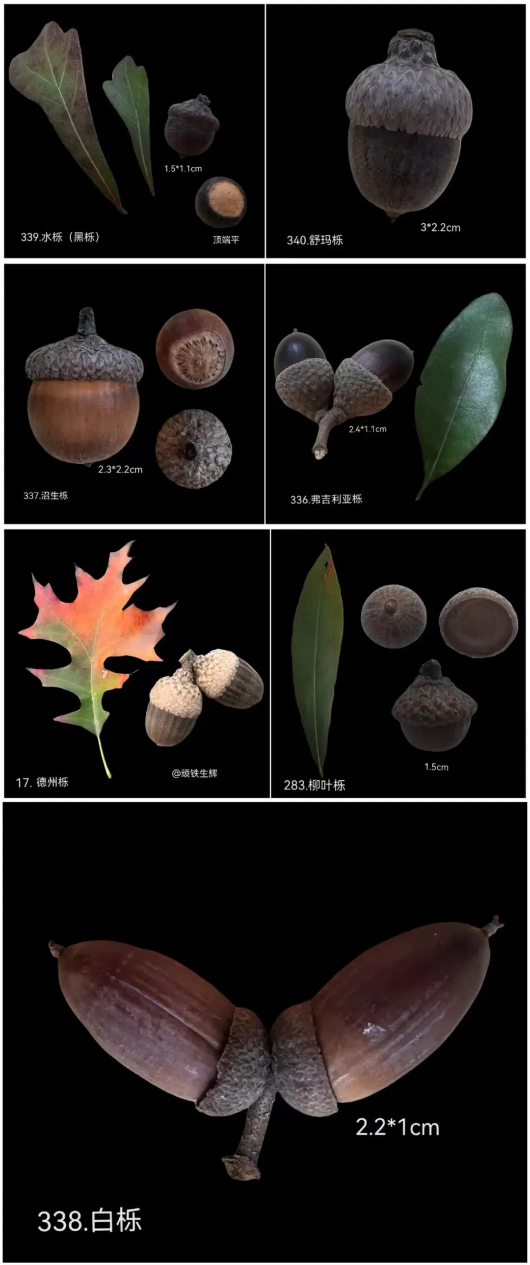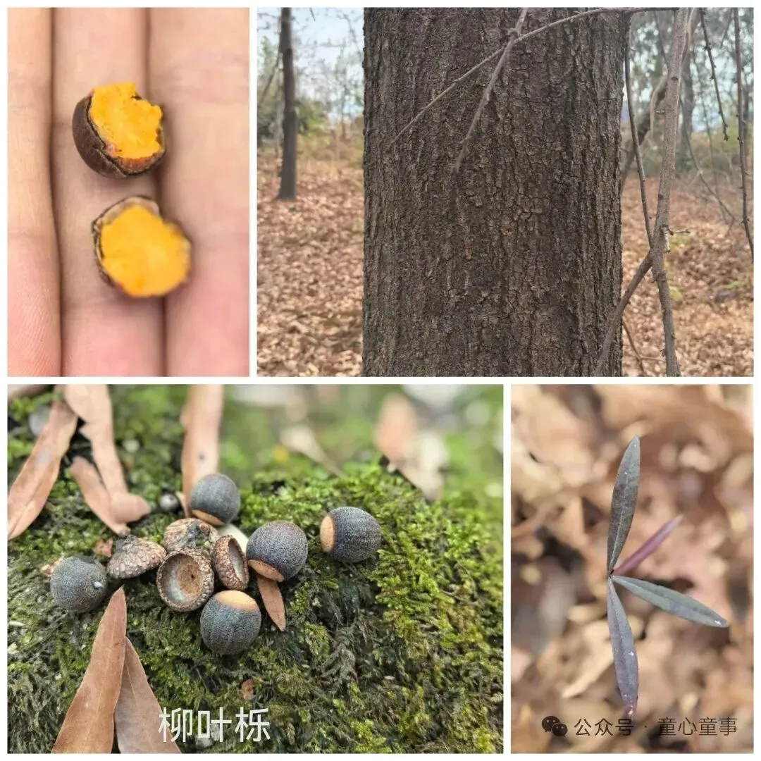 水栎,也叫黑栎,还有别名鸭脚栎。果实顶部比较扁平,“屁股”几乎占满。柳叶栎占比小一些。