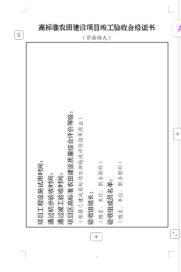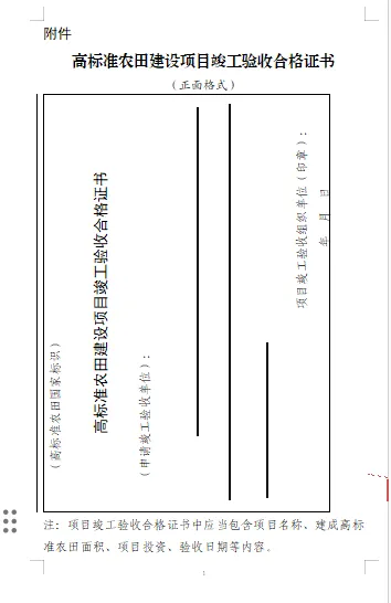 附件:高标准农田建设项目竣工验收合格证书(正面格式、背面格式)
