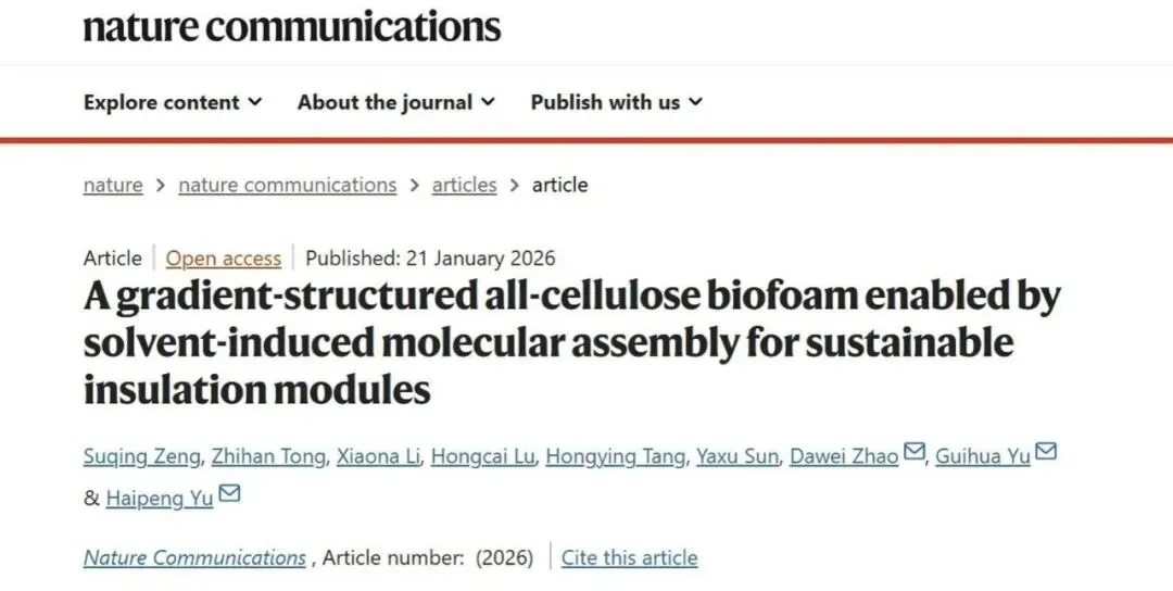近日,国际知名期刊《Nature Communications》在线发表了由东北林业大学木本油料资源利用全国重点实验室的于海鹏教授团队联合沈阳化工大学的赵大伟教授以及德克萨斯大学奥斯汀分校的余桂华教授共同完成的研究成果,题为“A gradient-structured all-cellulose biofoam enabled by solvent-induced molecular assembly for sustainable insulation modules”的论文。这项研究介绍了一种通过溶剂诱导分子组装策略来实现纤维素梯度结构全纤维素生物泡沫(All-Cel foam)的方法,为可持续隔热模块的应用开辟了新路径。该方法借助乙醇诱导纤维素超分子氢键网络重构,使得纤维素分子自发形成类似胞壁的结构,并最终制备出具有蜂窝状梯度孔结构的全纤维素生物泡沫。点击阅读该团队近期相关研究成果: