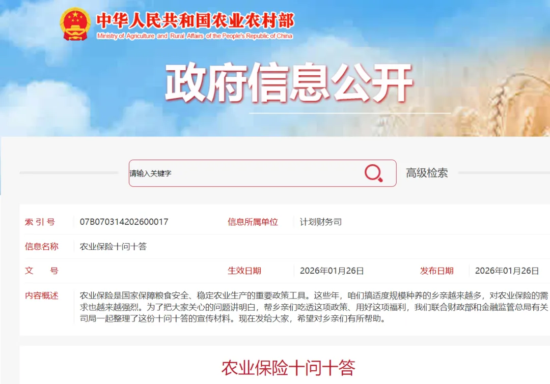农业保险是国家保障粮食安全、稳定农业生产的重要政策工具。这些年,咱们搞适度规模种养的乡亲越来越多,对农业保险的需求也越来越强烈。为了把大家关心的问题讲明白,帮乡亲们吃透这项政策、用好这项福利,我们联合财政部和金融监管总局有关司局一起整理了这份十问十答的宣传材料。现在发给大家,希望对乡亲们有所帮助。