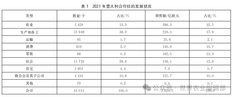 此阶段是意大利合作社制度主动 “重构” 与深度创新阶段。20 世纪末,面对全球化、资本渗透及欧盟一体化的深刻挑战,意大利改革合作社制度。2004 年,根据中道右派提出的促进大规模合作社股份公司化议案,规定合作社可以自由选择 “互益性”;设立不同领域的非纳税公积金上限;允许合作社公司化,使得立法更加符合社会经济的变化需求。这些改革是对资本短缺与成员异化难题的战略性回应,实质上是对传统罗虚代尔原则的一次有目的的突破。2015 年,意大利建立全国性合作社注册系统(Albo Nazionale delle Cooperative),清晰界定合作社身份;强化治理与审计、激励社会合作功能等措施,旨在提升合作社的公信力和社会影响力,同时抑制制度滥用,确保其为成员与社会公众服务的宗旨。2024 年,意大利全面优化 “合作社合规制度”(Cooperative Compliance Regime, CCR),通过降低准入门槛、强化税务治理、提供激励机制等措施,推动合作社制度的现代化和透明化。这些举措表明,意大利合作社制度正在通过制度创新,试图在坚守互益性本质与吸纳市场效率之间建立新的平衡,以实现其在 21 世纪复杂环境中的可持续演化。随着大量国际资本间的竞争加剧,农业经营结构变化,意大利农业合作社发生了重大变化,小型农业合作社不断合并,产业链下行渗透,出现了葡萄酒生产、蔬菜加工、肉类加工类合作。截至 2021 年底(表 1),意大利合作社数量为 41011 个,涵盖农业、工业、服务业、金融等多个领域,其中农业合作社 5459 个,占合作社总数的 13.3%;农业合作社销售额为 396.3 亿欧元,占合作社总销售额的 32.5%;农业合作的社均销售额为 725.9 万欧元,高于意大利合作社平均水平 143.9%,排名仅次于零售类合作社,位居第二;农业合作社成员超过 125.5 万个,对意大利国内生产总值的贡献率超过 8%。总体来看,意大利农业合作社制度的演化历程,清晰地展示了制度体系如何从底层自发创生,历经政治裹挟、法律规范化,再到主动应对全球性挑战的动态过程。其每一次重大转型,都是外部环境压力与内部制度张力共同作用的结果,体现了制度演化的路径依赖、关键节点、适应性效率等核心机制。4 意大利农业合作社制度的主要特征