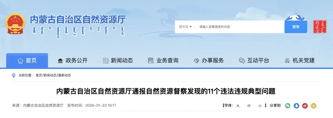 5.通辽市奈曼旗新镇君晟矿业有限公司非法采矿问题。2025年6月督察发现,君晟矿业有限公司在未取得合法采矿和用地手续的情况下,违法占用破坏奈曼旗新镇山嘴村土地27.73亩(耕地12.51亩),进行非法露天开采花岗岩。