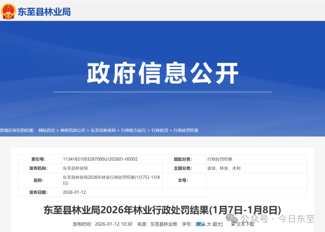 近日,池州市东至县林业局公开了两条2026年林业行政处罚结果,东林林罚决字〔2026〕第001号、第002号。东至县****服务部和凤阳县******有限公司因擅自改变林地用途,被要求限期恢复植被和林业生产条件,同时,分别处以罚金83884元和56816元。