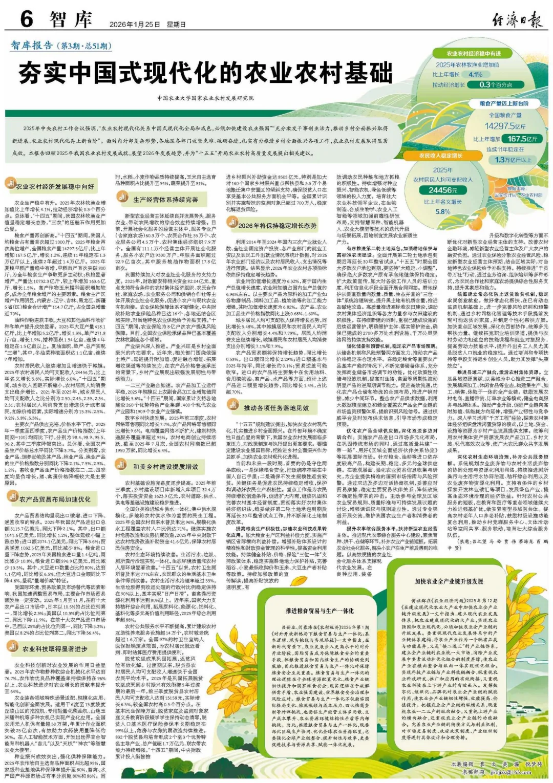 2025年中央农村工作会议强调,“农业农村现代化关系中国式现代化全局和成色,必须加快建设农业强国”“充分激发干事创业活力,推动乡村全面振兴取得新进展、农业农村现代化再上新台阶”。面对内外部复杂形势,各地区各部门攻坚克难、砥砺奋进,扎实有力推进乡村全面振兴各项工作,农业农村发展取得显著成效。本报告回顾2025年我国农业农村发展成就,展望2026年发展趋势,并为“十五五”开局农业农村高质量发展提出相关建议。