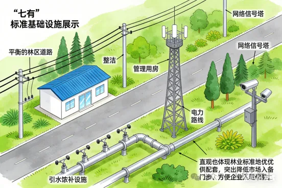为进一步降低市场准入门槛,吸引更多社会资本投身林业产业,多地在推进林业标准地建设过程中,借鉴工业园区“三通一平”的成熟模式,打造了“七有”配套标准——即有路可达、有房可用、有水保障、有轨(运输轨道)便捷、有网覆盖、有电供应、有眼(监控溯源系统)护航。完善的基础设施配套,有效免去了企业及种植大户在项目前期投入大量人力、物力、财力用于基础建设的困扰,大幅提升了市场主体的投资积极性。