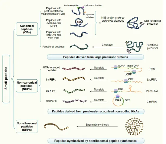 系统梳理了植物小肽的多样化来源(图1),将其分为三大类:经典小肽、新型小肽和非核糖体肽。其中,经典小肽(CPs)来源于具有明确功能域的前体蛋白,可进一步分为翻译后修饰肽、富含半胱氨酸肽等;新型小肽(NCPs)来源于基因组的“非编码”区域,主要包括:UTRs编码的小肽、lncRNA编码的小肽、miRNA编码的小肽和circRNA编码的小肽;非核糖体肽则独立于经典的转录翻译路径,由非核糖体肽合成酶催化多种蛋白源或非蛋白源氨基酸组装而成。