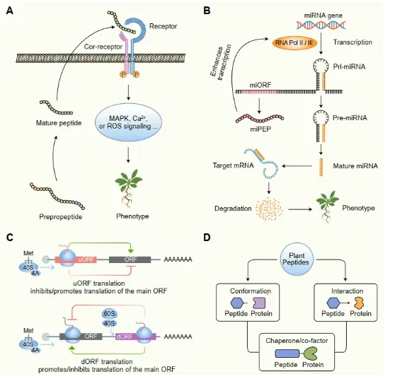 进一步总结了植物小肽发挥功能的四种核心分子机制(图3):在细胞外,分泌型小肽通常作为配体与质膜受体激酶结合,激活MAPK、钙离子等下游信号通路,从而调控植物发育与免疫应答;在细胞核内,miRNA前体编码的小肽能够直接结合其对应pri-miRNA的启动子,增强转录,形成正反馈调控环路;在翻译层面,UTR区编码的小肽能够影响核糖体扫描或再起始过程,精细调控下游基因的翻译效率;此外,部分小肽在细胞内直接作为分子伴侣或结构组分,通过与特定靶蛋白相互作用,调控其定位、稳定性或生物学活性。