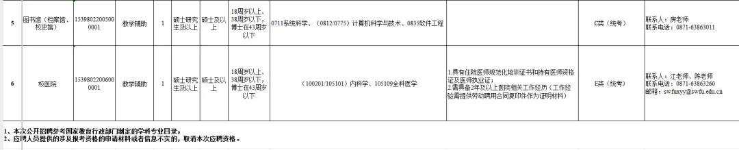 资格初审由西南林业大学负责,采用计算机和人工审核相结合的方式进行,具有专业要求的岗位由招聘单位进行人工审核。所学专业不在选定的参考目录中,但与岗位所要求的专业类同的应聘人员,可以主动联系招聘单位确认报名资格。资格审查贯穿公开招聘全过程,任何环节发现应聘人员不符合资格条件的,取消应聘或者聘用资格。