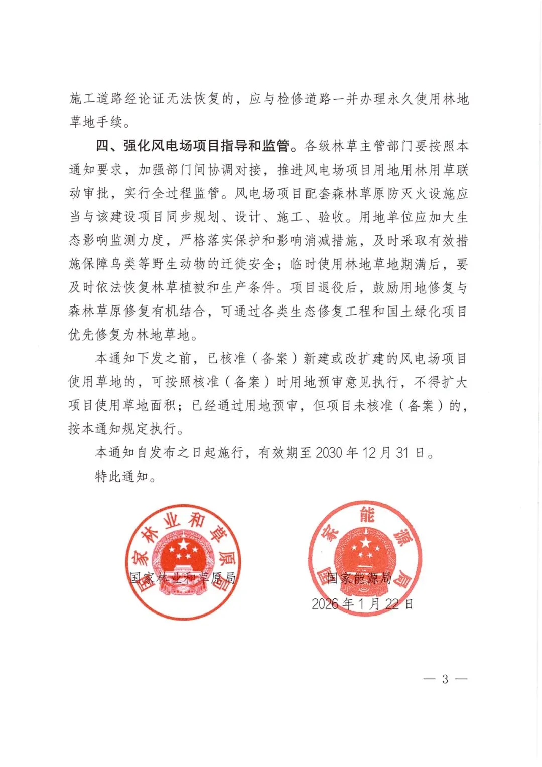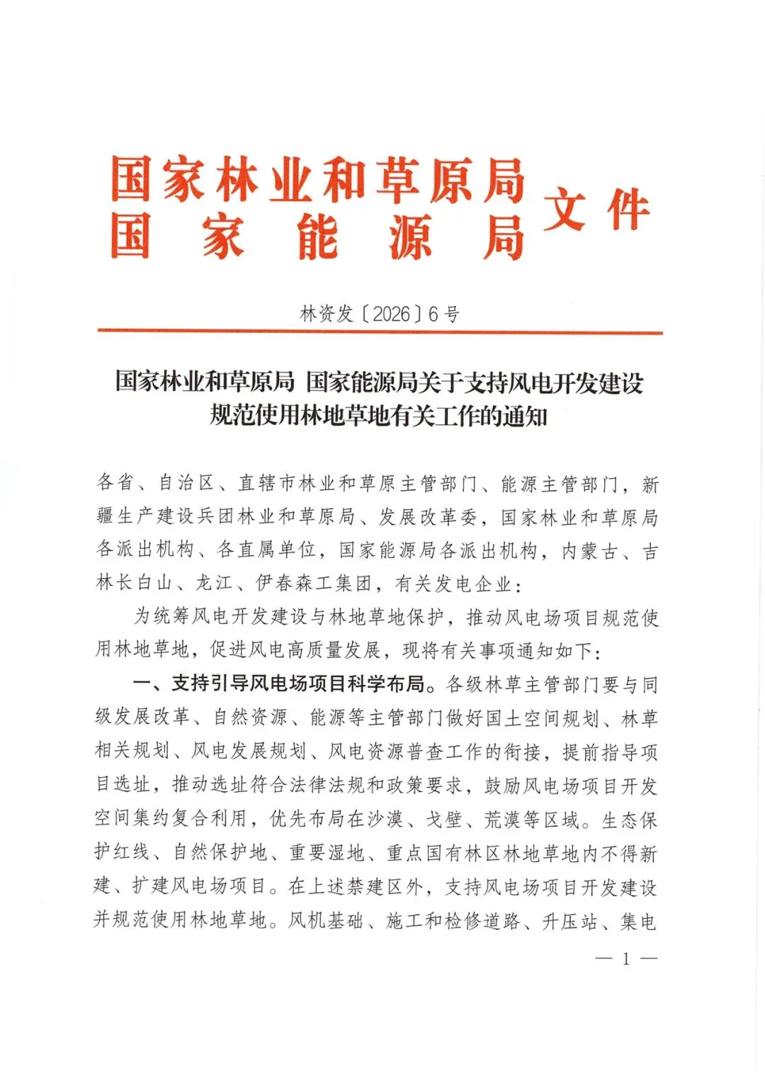 国家林业和草原局 国家能源局关于支持风电开发建设规范使用林地草地有关工作的通知(林资发〔2026〕6号)