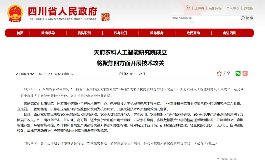 2026年1月21日,平台成立仪式依托两大核心会议召开:一是四川省农业科学院“十四五”重大科技成果发布会,二是2026科技成果转化提质加速增效年启动会。双重会议背景明确研究院核心使命——以人工智能技术为纽带,推动农业科技成果转化落地,助力农业数智化转型。