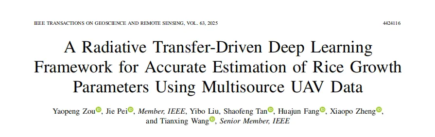 Y. Zou et al., "A Radiative Transfer-Driven Deep Learning Framework for Accurate Estimation of Rice Growth Parameters Using Multisource UAV Data," in IEEE Transactions on Geoscience and Remote Sensing, vol. 63, pp. 1-16, 2025, Art no. 4424116, doi: 10.1109/TGRS.2025.3643447.