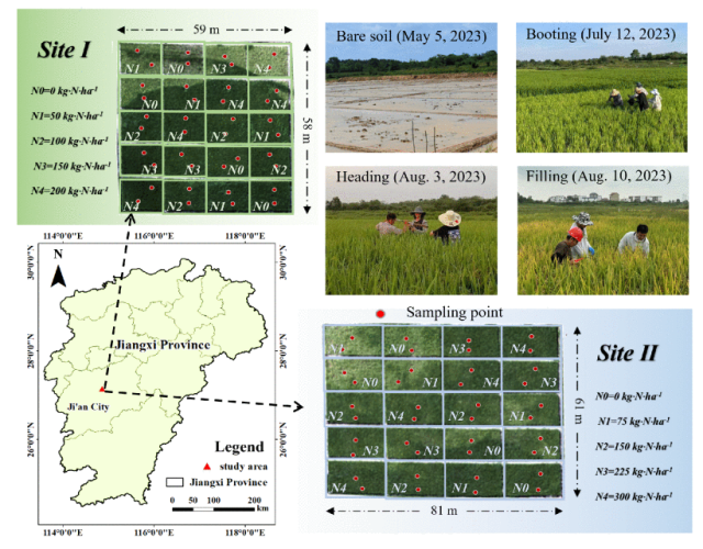 叶面积指数(LAI)和叶片叶绿素含量(LCC)是表征水稻生长动态的关键指标。尽管基于无人机(UAV)的高光谱数据已被广泛应用于作物监测,但其高维冗余特性给有效信息提取带来了较大挑战。为此,本文提出了一种通用的两阶段反演框架。首先,利用受田间条件约束的 PROSAIL 辐射传输模型生成合成光谱数据,训练引入自注意力机制的一维卷积神经网络(1D-CNN),从高冗余高光谱数据中提取光谱复合变量(Spectral Composite Variables,SCVs)。随后,将所获得的 SCVs 与冠层温度(由热红外 TIR 传感器获取)以及作物高度(由无人机 LiDAR 与 RGB 影像获得)进行融合,构建 LAI 和 LCC 的多源联合反演模型,并通过同点与跨点验证策略对模型性能进行评估。结果表明,所提取的 SCVs 与 LAI 和 LCC 之间具有较强相关性,其平均相关系数分别为 0.83 和 0.85。所提出的框架在各生育阶段(如孕穗期、抽穗期和灌浆期)均表现出较高的反演精度,LAI 和 LCC 的平均决定系数(R²)分别达到 0.76 和 0.71。其中,在抽穗期模型性能最优,LAI 的 R² 和 RMSE 分别为 0.83 和 0.47,LCC 的 R² 和 RMSE 分别为 0.77 和 4.13 μg·cm⁻²。跨点验证进一步证实了模型的稳健性与可迁移性,且在不同试验区中均在抽穗期取得最佳表现。基于该框架生成的厘米级分辨率 LAI 与 LCC 空间分布图与实测高度一致,可实现对水稻生长状况的精细化监测。总体而言,本文提出的辐射传输驱动深度学习框架为解决高光谱冗余问题和提升作物生长参数反演精度提供了一种稳健且具有良好推广潜力的技术方案。