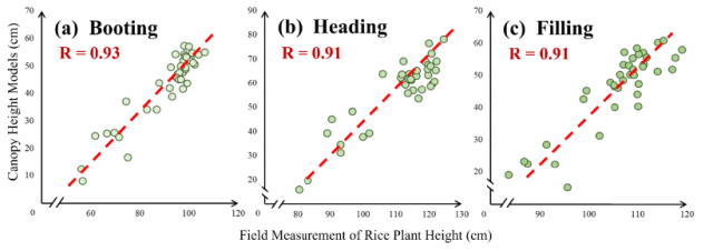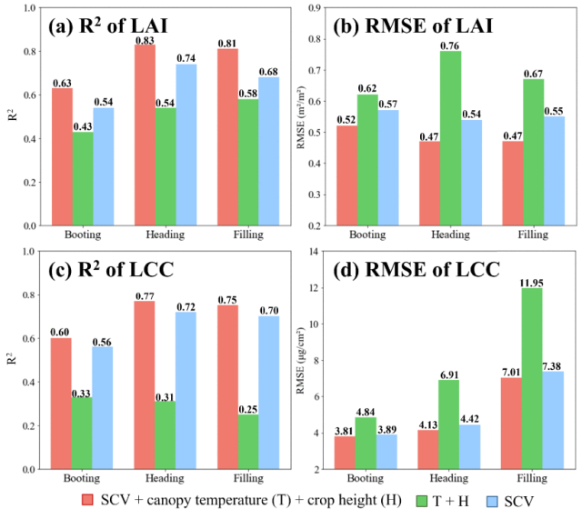 图6. 不同生长阶段水稻生长参数(LAI与LCC)与无人机衍生的变量(SCV、冠层温度及作物高度)之间的相关性