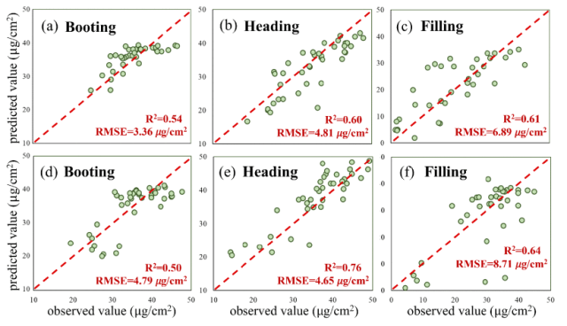 图7. 不同模型组合下,抽穗期、抽穗期及灌浆期LAI(a)和(b)以及LCC(c)和(d)的估测精度
