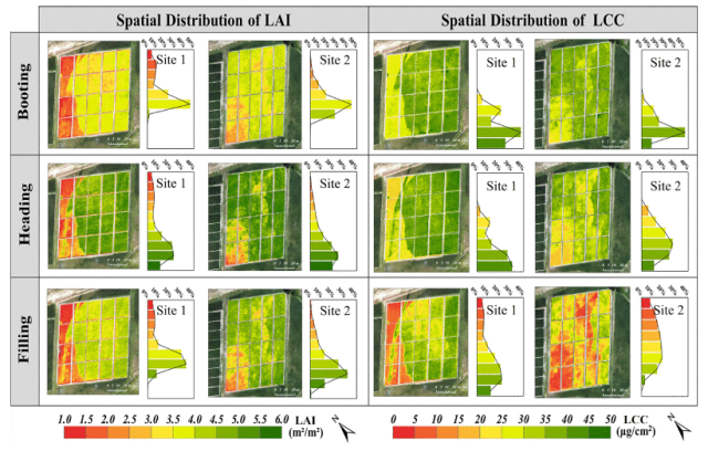 图10. 水稻不同生长阶段及不同地块的LAI与LCC空间分布图
