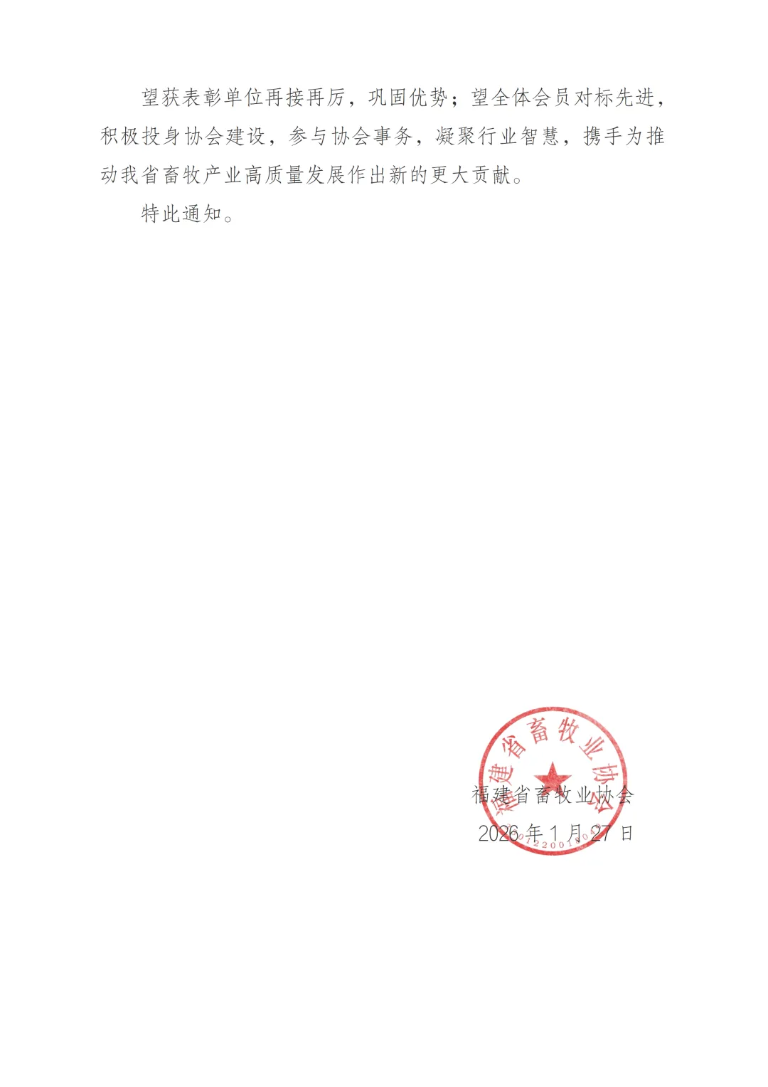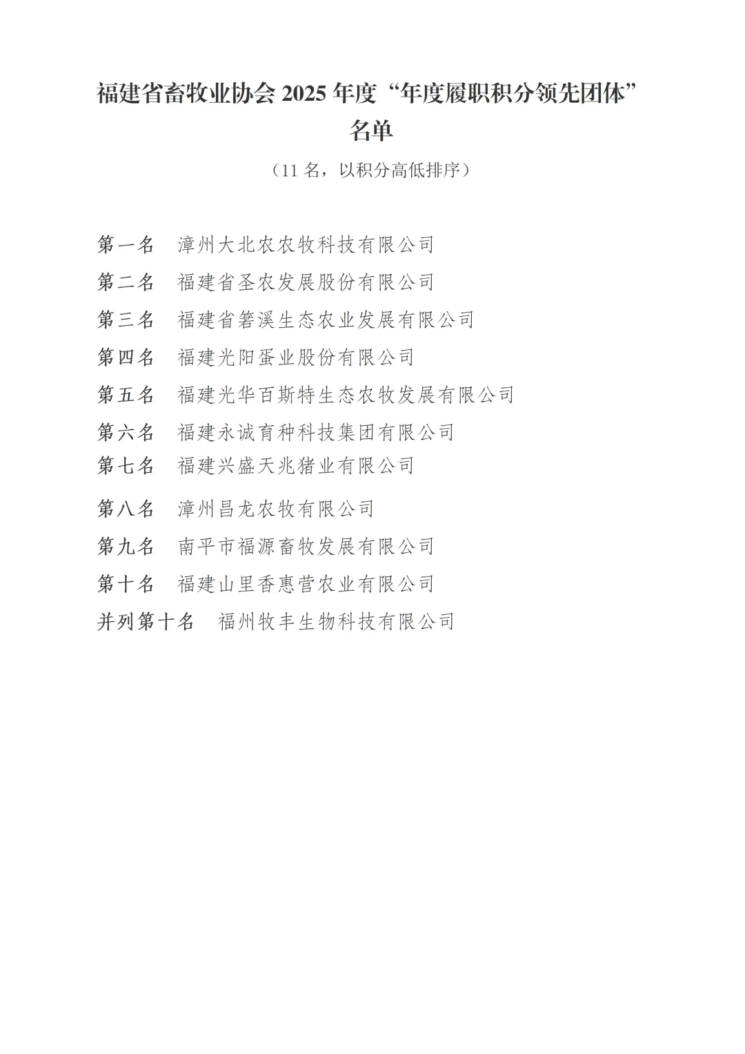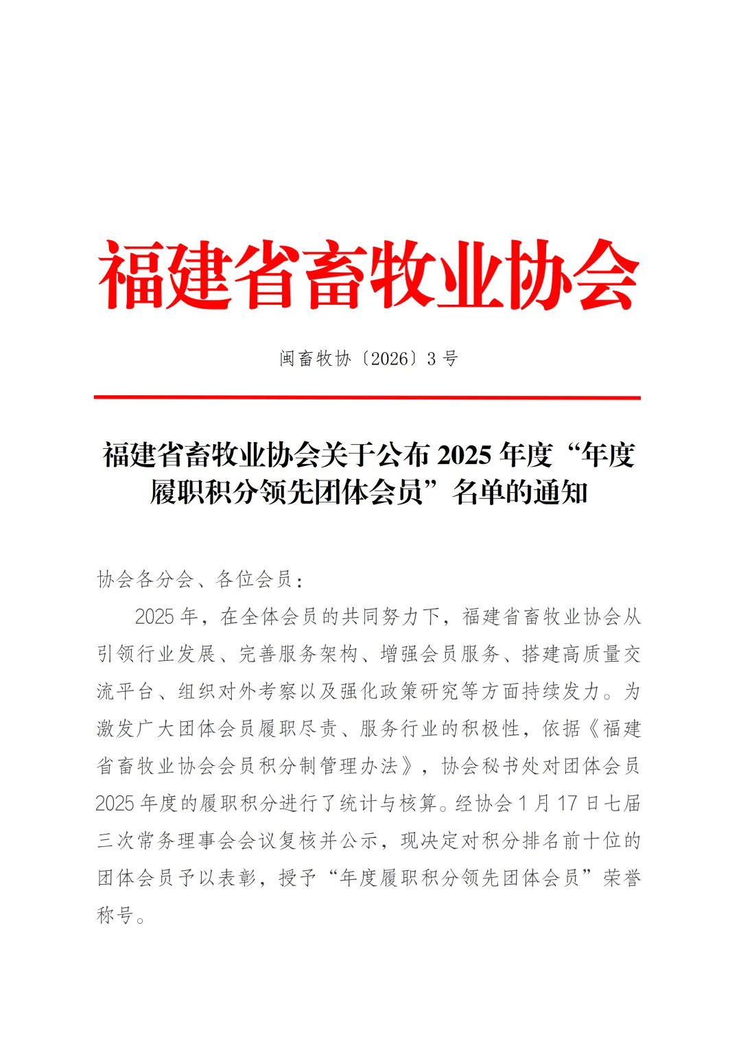 >福建省畜牧业协会关于公布2025年度“年度履职积分领先团体会员”名单的通知
