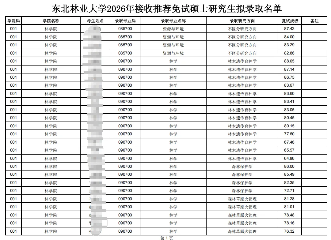 今天为大家收集整理到的是东北林业大学2026年接收推荐免试研究生拟录取名单.pdf,文件部分内容展示如下: