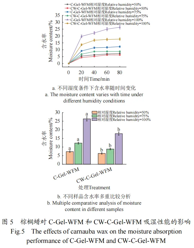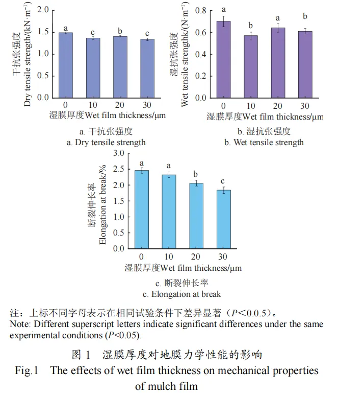通过改变棕榈蜡阻隔层厚度,探究其对CW-C-Gel-WFM性能的影响。结果显示,随着阻隔层厚度增加,地膜力学性能略有下降,透气度明显下降,但其性能仍满足使用需求。经棕榈蜡涂覆后,CW-C-Gel-WFM含水率低于秸秆纤维基明胶涂层抑菌地膜(carbendazim gelatin straw-fiber-based mulch film,C-Gel-WFM)。