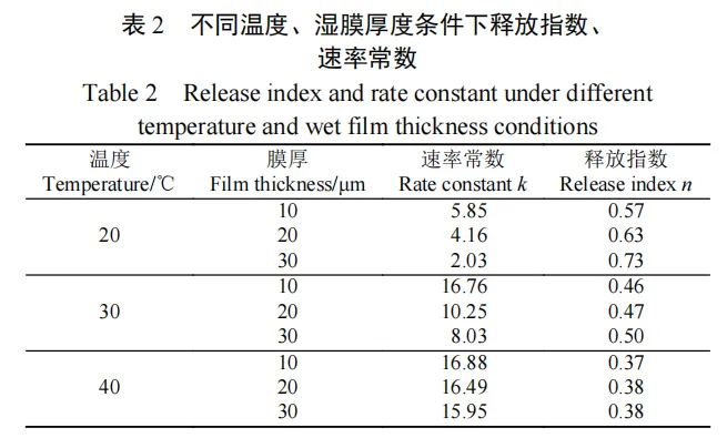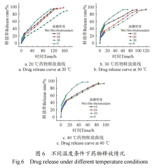 药物缓释动力学表明,30 μm阻隔层使缓释时间长达96~168 h,较C-Gel-WFM延长48~60 h;40 ℃以上药物释放遵循Fickian扩散机制,40 ℃以下则遵循非Fickian扩散机制。