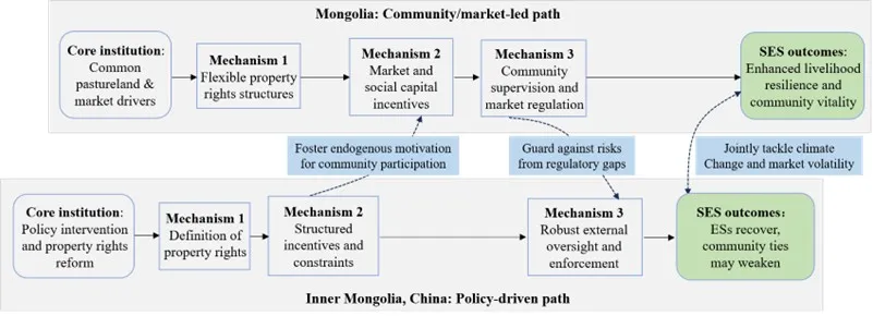 这种趋同的背后,却有着截然不同的驱动逻辑。在中国内蒙古,草原生态的改善主要归功于国家层面强有力的政策干预,例如“草畜平衡”制度和一系列生态补偿机制,这些措施通过大规模工程实施有效促进了草原生态系统的恢复,相关成果此前已在《Environmental Impact Assessment Review》(影响因子11.2)上发表。而在蒙古国,生态改善则更多源于以社区为核心的自然生态系统管理方式,该模式不仅明确界定了各利益相关方的角色,还充分吸纳了当地牧民的传统生态知识,在提升保护成效的同时,也增强了牧区居民的生计韧性。