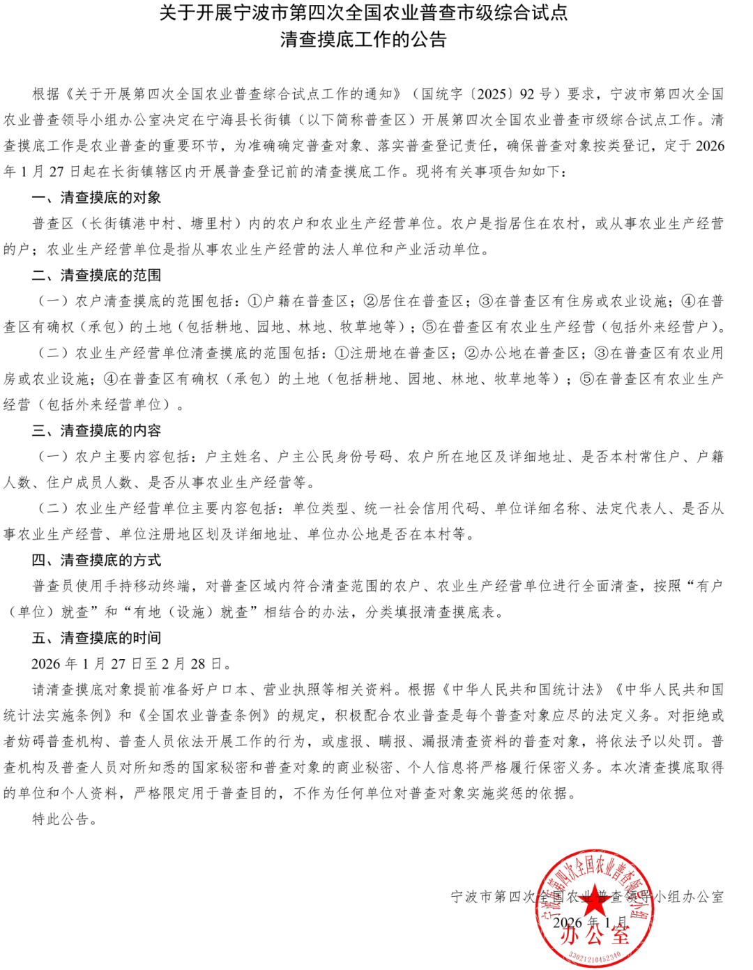 企业、合作社、农场等,只要注册地、办公地、农业用房(设施)、承包土地或经营活动在港中村或者塘里村内,就属于本次试点普查对象。
