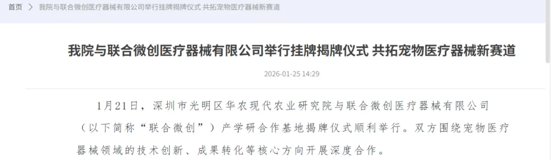 1月21日,深圳市光明区华农现代农业研究院与联合微创医疗器械有限公司(简称“联合微创”)产学研合作基地揭牌仪式顺利举行。双方明确将聚焦宠物医疗器械领域,以技术创新和成果转化为核心方向开展深度合作。