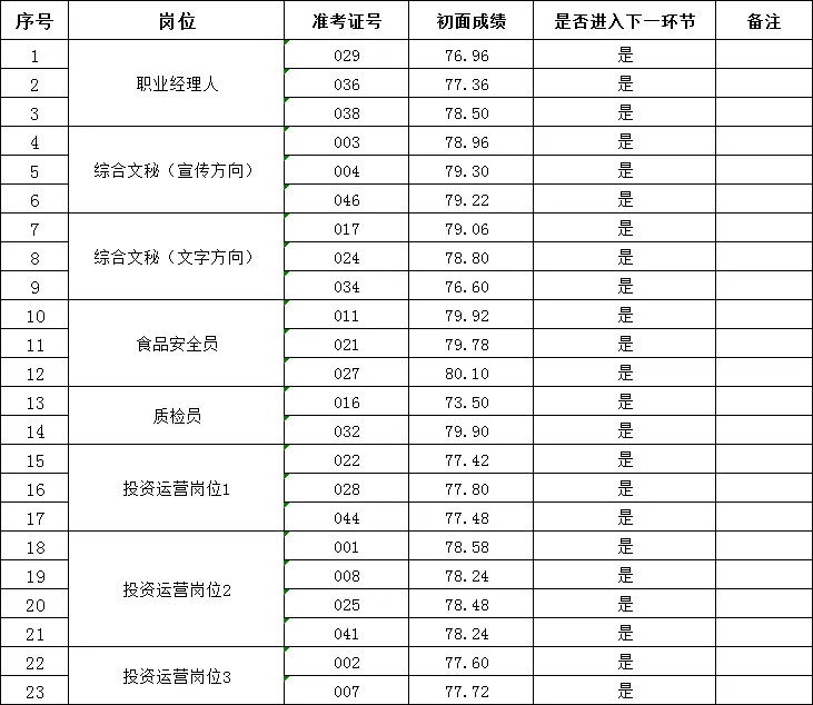 依据招聘公告,按照各岗位计划数1:3的比例,确定二面候选人,末位成绩并列的,一并进入后续环节。进入下一环节人员初面成绩如下: