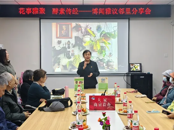 另一边,在 “花事雅聚 酵素传经 —— 博闻雅议邻里分享会” 上,社区居民围坐一堂,分享着各自制作酵素的心得与妙用。大家展示了酵素在家庭养花、清洁等方面的神奇效果,现场气氛温馨热烈。居民们纷纷表示,通过制作和使用酵素,不仅减少了家庭垃圾的产生,还为生活增添了一抹绿色,这种 “变废为宝” 的生活方式值得更多人学习和推广。