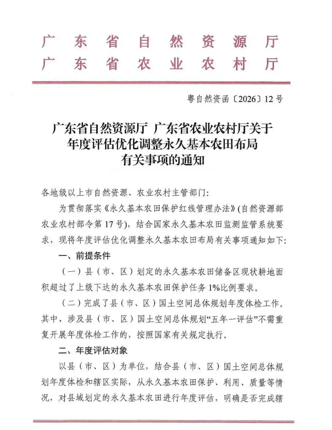 >广东省自然资源厅 广东省农业农村厅关于年度评估优化调整永久基本农田布局有关事项的通知
