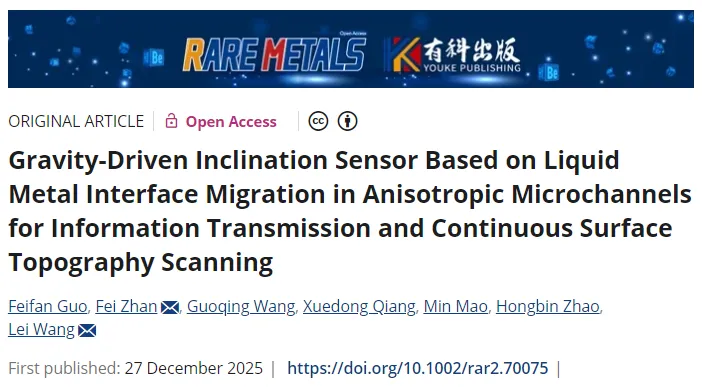 日前,北京林业大学 Feifan Guo、Fei Zhan(共同第一作者),Lei Wang(磊王,通讯作者)联合南通计量测试所、有研集团等单位的研究团队,在Rare Metals上发表了题为 “Gravity-Driven Inclination Sensor Based on Liquid Metal Interface Migration in Anisotropic Microchannels for Information Transmission and Continuous Surface Topography Scanning” 的研究文章,提出了基于针茅仿生各向异性微通道与液态金属动态润湿行为的重力驱动倾角传感器设计方案,成功实现信息传输与表面形貌扫描的多场景应用。