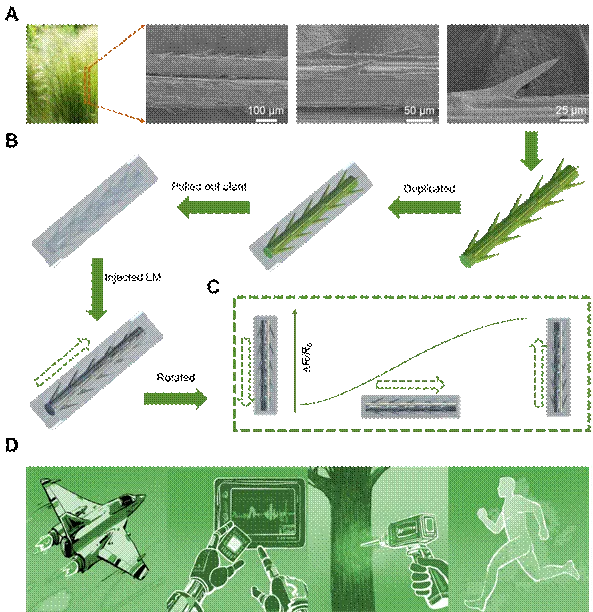研究团队以针茅(Stipa lessingiana)为仿生模板,用聚二甲基硅氧烷(PDMS)复制其表面的各向异性微观结构,制成内壁带有锥形凸起的微通道。随后将镓铟共晶合金(eGaIn)注入通道,利用重力倾斜时液态金属在三相界面的动态润湿行为(由拉普拉斯压力驱动),引发电阻变化,从而实现倾角检测。
