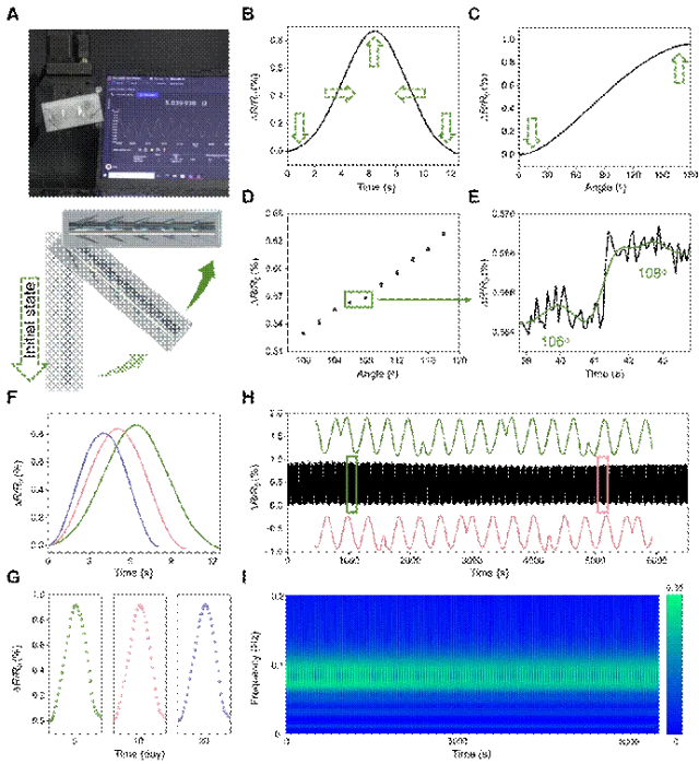 图2(A)倾角信号测试流程示意图;(B)传感器360° 旋转时的电信号变化率;(C)不同倾斜角度下的电信号变化率;(D)传感器角度分辨率;(E)响应时间测试;(F)旋转频率对信号振幅的影响;(G)传感器长期使用寿命(每10 天测试一次);(H)0.1 Hz频率下500 次循环耐久性测试;(I)耐久性性能的小波变换分析