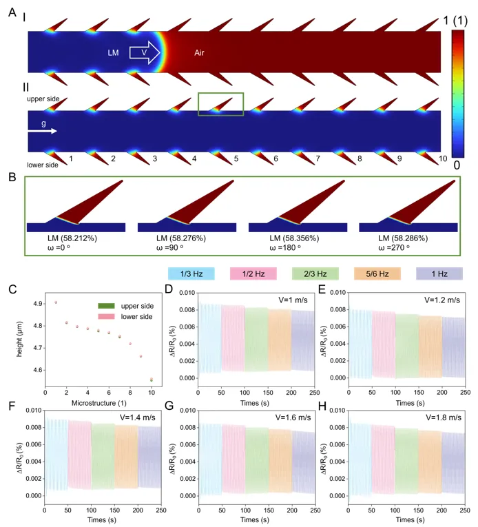 图 4(A)液态金属注入微通道的相场仿真及倾斜过程中气 - 液界面迁移仿真;(B)传感器倾斜过程中微结构内液态金属含量变化仿真;(C)微通道内液态金属表面高度变化仿真;(D-H)不同注入速度(1-1.8 m s-1)下,传感器在不同旋转频率(1/3-1Hz)的电信号变化仿真