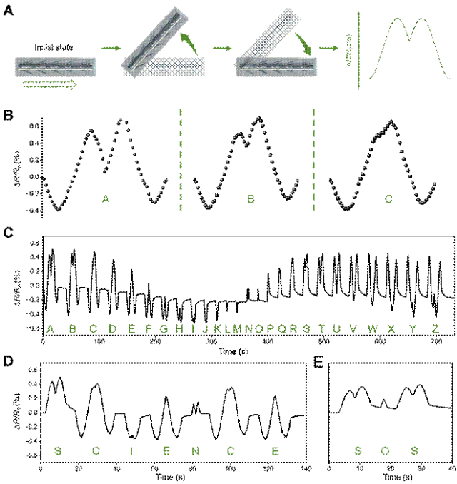 图 5(A)倾角传感器在语言编程中的应用流程;(B)定义特定电信号变化段对应字母 A、B、C;(C)26 个英文字母与电信号变化段的映射关系;(D)传输 “SCIENCE” 文本信息的电信号序列;(E)传输 “SOS” 文本信息的电信号序列