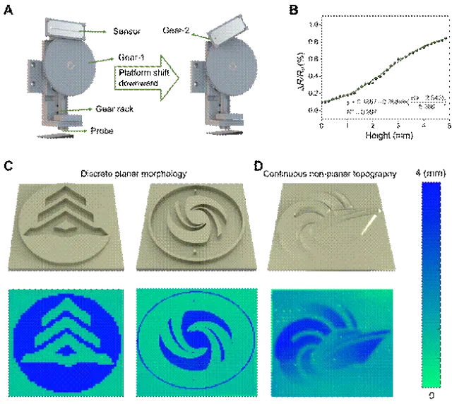 图 6(A)倾角传感器与 3D 移动平台集成的表面形貌扫描系统(齿轮齿条传动);(B)表面形貌高度与电信号变化率的相关性;(C)离散平面形貌的扫描与重建结果;(D)连续非平面形貌的扫描与重建结果(含北京林业大学、南通计量测试所标识)
