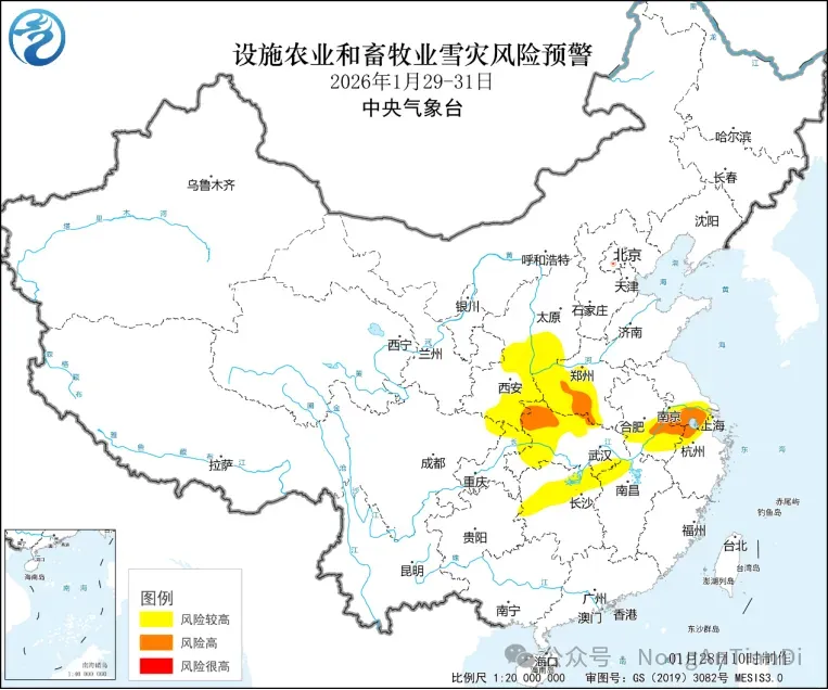 农业农村部和中国气象局2026年1月28日联合发布设施农业和畜牧业雪灾风险预警:预计1月29-31日,受中等强度冷空气影响,中东部地区有较大范围降水天气过程,青藏高原东部、西北地区东部、华北、黄淮西部和南部、江汉、江淮、江南西部等地有小雪或雨夹雪,其中陕西、山西、河南、湖北、江苏、安徽、湖南等地部分地区有中到大雪,局地暴雪。陕西中部和东部、山西西南部、河南西部、湖北西北部、江苏南部、安徽南部、湖南北部、江西西北部等地设施农业和畜牧业雪灾风险较高,河南南阳、驻马店,湖北十堰、襄阳、神农架,安徽马鞍山、芜湖、宣城,江苏南京、常州、镇江、无锡、苏州,浙江湖州等地雪灾风险高,积雪可能导致农业设施和畜禽圈舍垮塌,造成损失。