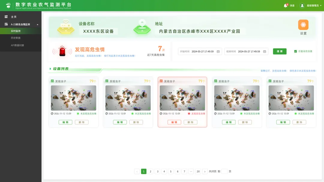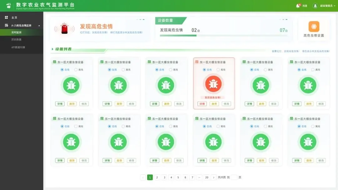 在农业生产中,虫害一直是影响农作物产量和质量的关键因素。传统的虫害监测方式往往依赖人工巡查,效率低、准确性差,难以做到及时发现和有效防治。智农高危虫情发现系统应运而生,它利用先进的图像识别技术、大数据分析和人工智能算法,能够实时、精准地监测农田中的虫情,为农业生产提供全方位的虫害预警和解决方案。