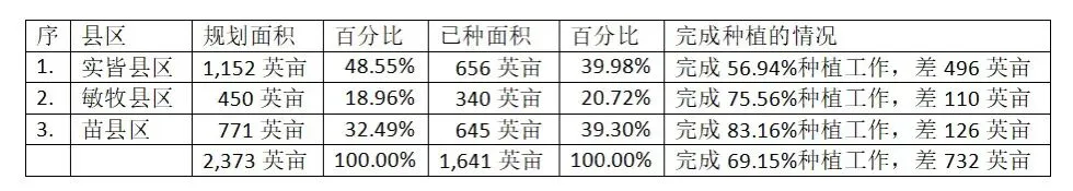 专区内各县区规划种植的辣椒面积及目前完成的种植面积如下表: