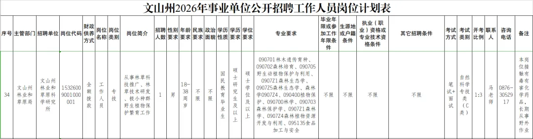 招聘岗位由招聘单位编报,招聘专业、学历等与岗位资格条件相关问题,由招聘单位及其主管部门负责解释。具体招聘岗位条件详见《文山州2026年事业单位公开招聘工作人员岗位计划表》(附件1,以下简称《岗位计划表》),报考人员可通过文山州人社网(https://wszrsj.ynws.gov.cn/)查询。