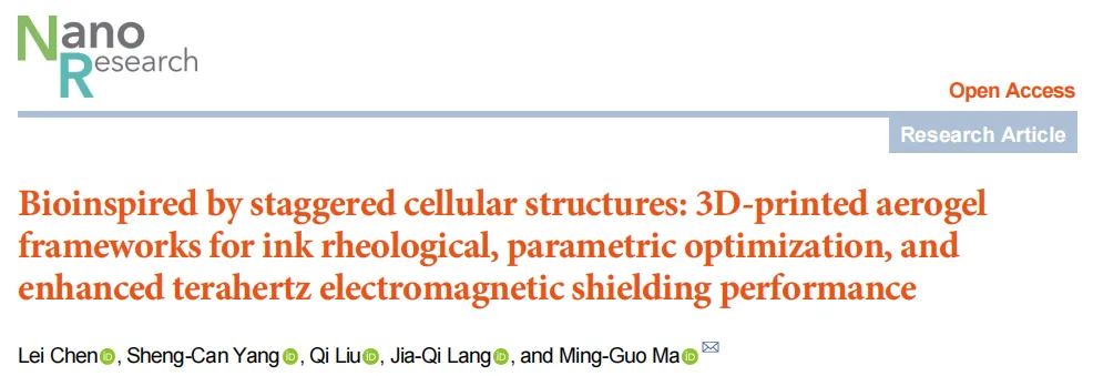 Lei Chen , Sheng-Can Yang , Qi Liu, et al. Bioinspired by staggered cellular structures: 3D-printed aerogel frameworks for ink rheological, parametric optimization, and enhanced terahertz electromagnetic shielding performance, Nano Research, 2026, 19, 94908105.