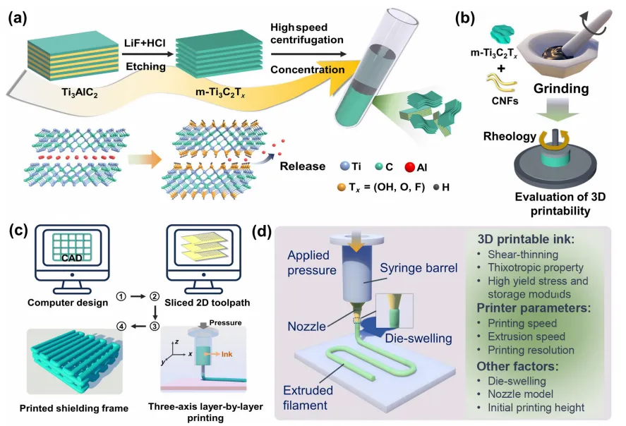 图1. 多层 MXene、复合墨水及打印框架的制备流程。