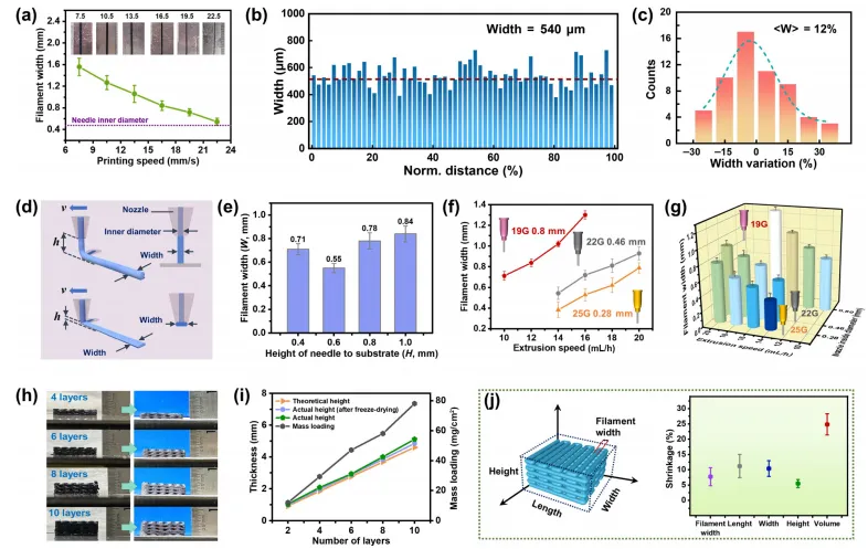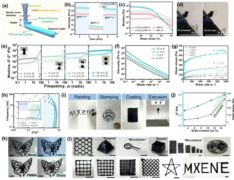 图2. m-Ti₃C₂Tₓ/CNFs 墨水的流变性能与 3D 打印适应性。