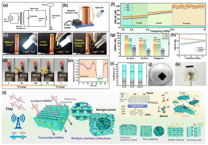 本研究通过DIW 3D打印制备了仿生交错堆叠的MXene/CNFs气凝胶框架,在太赫兹与微波频段均展现出卓越的电磁屏蔽与吸收性能。