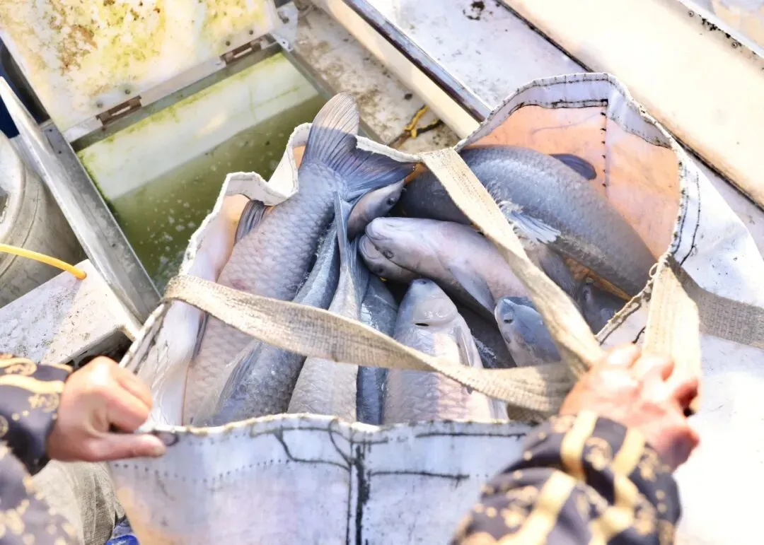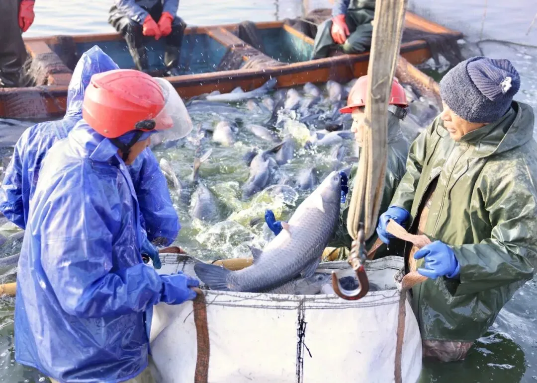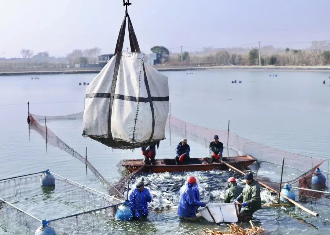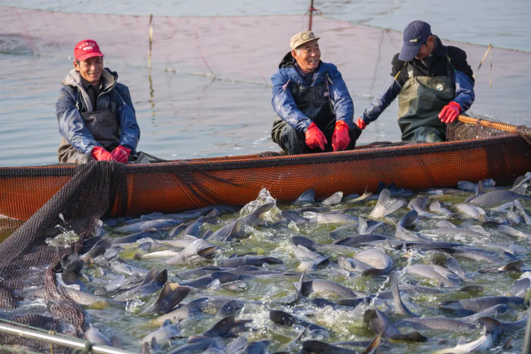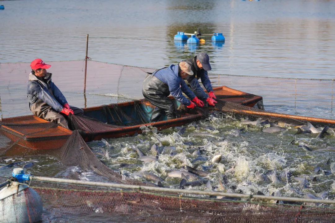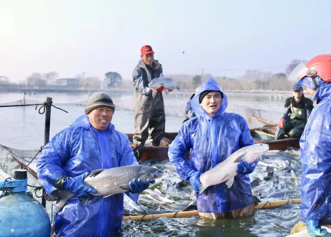 捕捞现场,一群群白鹭在鱼塘上空盘旋,鱼跃鸟欢展示迎新春的丰收场景。在半身高的水中分拣鱼儿的员工不时将大鱼抛向另一处网内,与青鱼一起成长的少量花链、鲫鱼等同样肥壮。