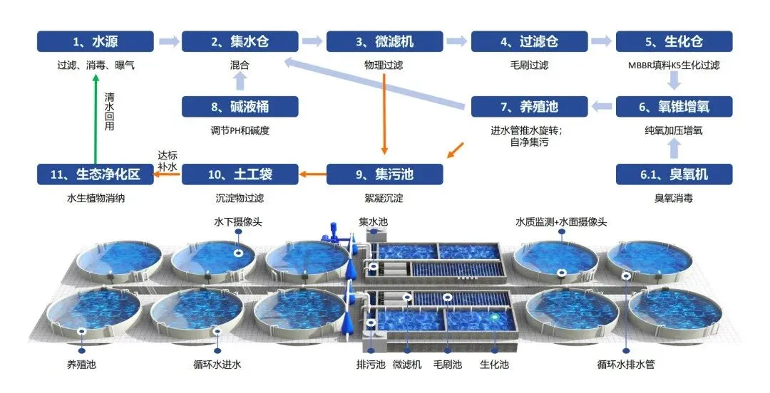 2. 循环水养殖工艺应用:采用“过滤-生化处理-增氧-生态净化”全流程循环技术,配套MBBR填料生化仓、氧锥增氧设备及水生植物净化区,实现养殖用水循环利用。