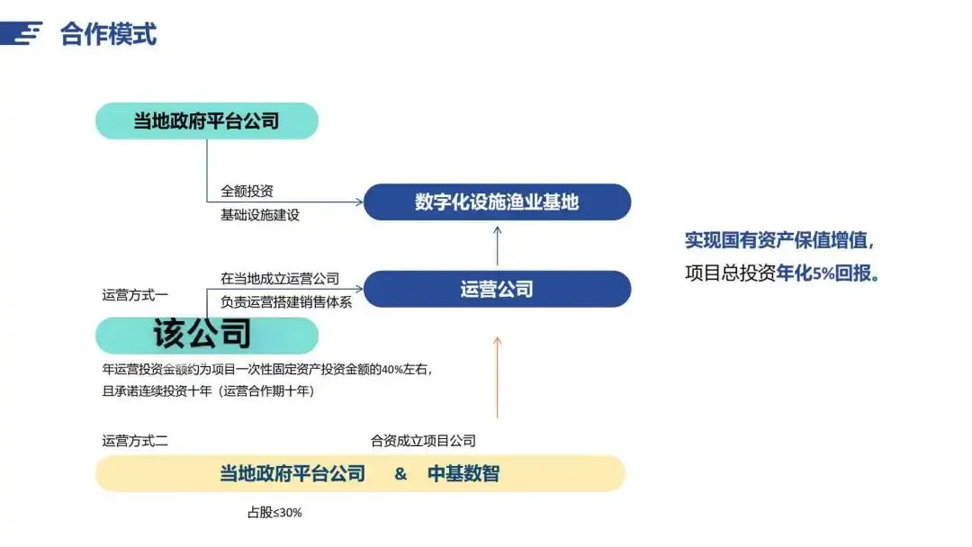 1. 合作架构:当地政府平台公司全额投资建设数字化设施渔业基地,负责基础设施建设与前期固定资产投入;该公司在当地成立运营公司,负责基地运营管理、销售体系搭建与技术支持。