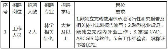 1.报名要求:采取网上报名形式,每位应聘者限报一个岗位,有意者请填写《林调公司专业技术人员应聘报名表》。并将《林调公司专业技术人员应聘报名表》、个人简历、身份证、毕业证书、学位证书、职称证书、注册执业证书、个人荣誉证书、毕业生推荐表、成绩单、原工作单位工作表现鉴定材料、重要业绩(项目)成果扫描件等相关证明材料,按邮件主题格式为“应聘岗位代码+姓名+毕业院校+专业+联系方式”。