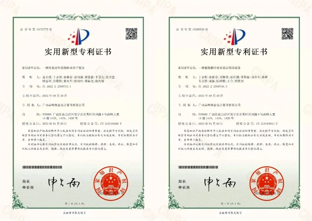 注重实用工具研发,自主研发的《一种简易野外植物标本烘干装置》与《一种植物腊叶标本装订辅助设备》获国家实用新型专利授权,有效提升野外标本制作效率与质量;基于全区第一次林草种质资源普查成果,独立出版《高峰森林公园观赏植物》专著,系统性梳理区域植物资源,彰显深厚专业积淀。